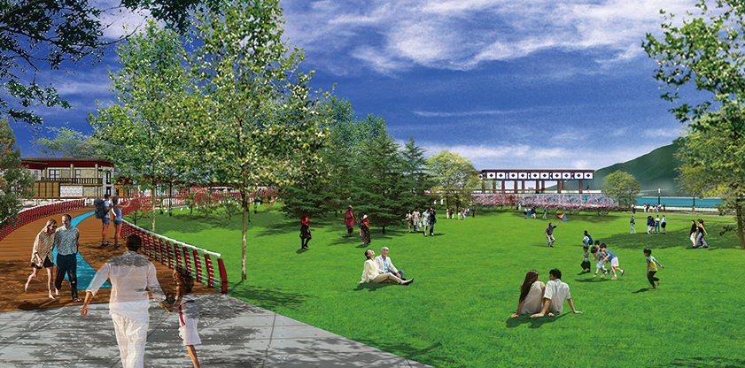 拉薩河景觀建設(shè)用地東起納金大橋,西至新拉貢公路大橋,位于拉薩河城區(qū)段百年大堤與子堤之間,總長度約20公里,總面積約400公頃。拉薩河景觀設(shè)計(jì)依據(jù)拉薩市總體規(guī)劃,遵循現(xiàn)有城市肌理,結(jié)合地形地貌,旨在將拉薩河打造為“多彩的哈達(dá),綠色的玉帶”,與布達(dá)拉宮遙相呼應(yīng),成為“高原明珠,雪域圣地”拉薩的綠色自然景觀。具有藏族特色的景點(diǎn)猶如五彩斑斕的寶石,散落在玉帶之中,科學(xué)有序的道路規(guī)劃將景點(diǎn)串聯(lián)起來,傳統(tǒng)文化與綠色在這里融合,不僅展示傳統(tǒng)藏區(qū)的風(fēng)貌,也體現(xiàn)未來高原圣地的綠色生態(tài)特色。