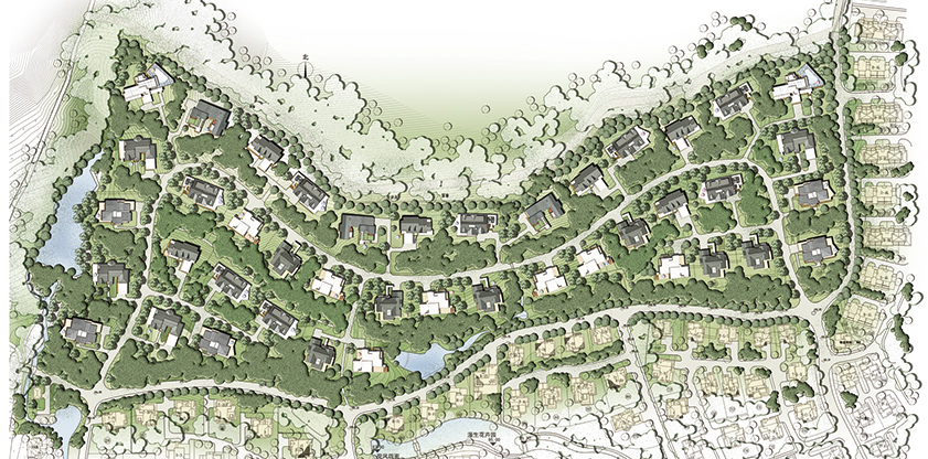 大面積的景觀綠化,加之大面積的天然活水塘使居住的環(huán)境品質(zhì)得以提升。以原始地形、地勢(shì)為依托,尊重天然的基地景觀特點(diǎn),通過建筑與基地的互補(bǔ)關(guān)系,進(jìn)行微地形改造處理。每種戶型均有與之適應(yīng)的一組相似地塊,使土方開發(fā)量保持最低,使人們?cè)谏钪凶杂X地感受山地帶來的無窮樂趣。