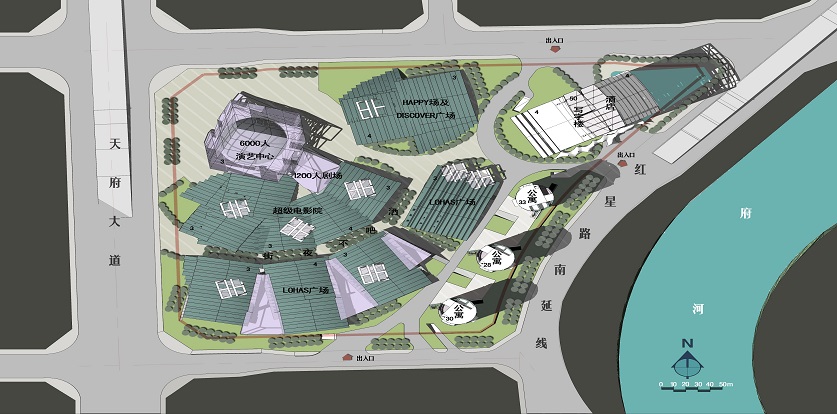 根據(jù)周邊交通及自然條件,基地具有西側(cè)交通便利、東側(cè)擁有可利用自然資源的特征。沿天府大道一側(cè)布置人流密集、需要便捷交通的大型演藝中心及劇場,使之成為有活力、富于特色的標(biāo)志性城市建筑。而將超星級酒店、寫字樓及公寓沿河布置,充分利用府河水資源,同時也提升了沿河的城市景觀形象。通過基地中心地帶的娛樂和酒吧不夜街區(qū),將兩者有機的組合為一個完整的城市文化娛樂綜合體。